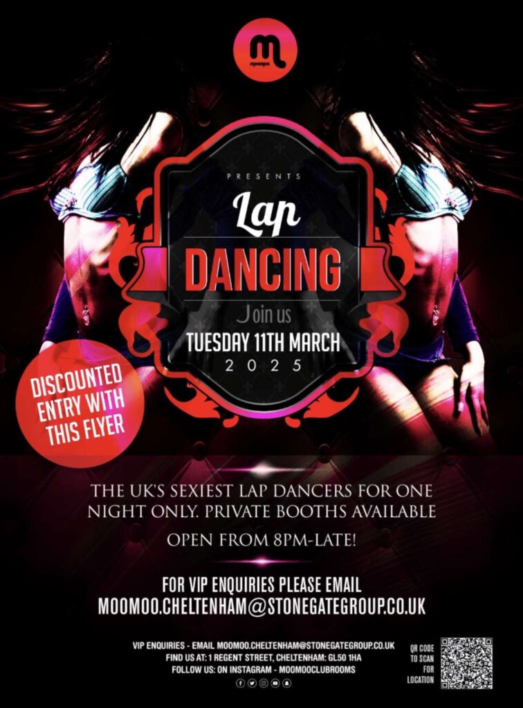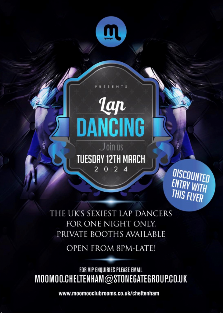 This year our beautiful girls will be available for fully nude private lap dances from 8pm on Tuesday 12th March 2024. We are delighted to announce that MooMoo Clubrooms (1 Regent St, Cheltenham, GL50 1HE) will be hosting us this year!